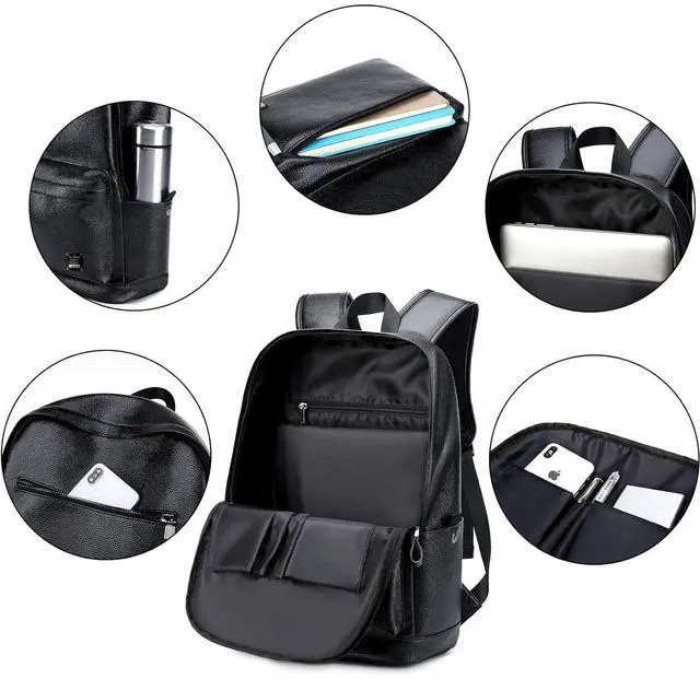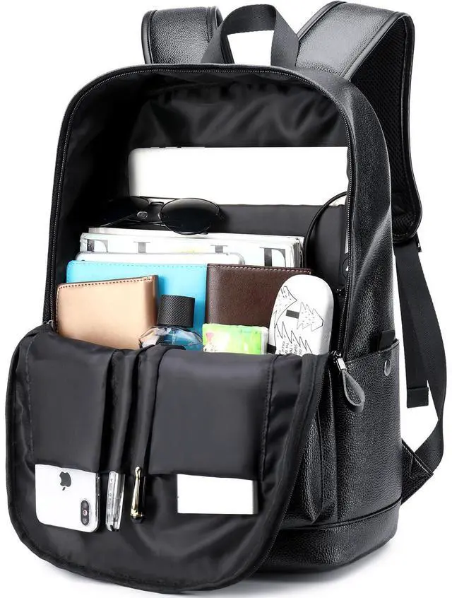 Leather Laptop Work/Shool/Travel Backpack with Lots of Pockets: 1 roomy main double zippered pocket with small inner pouches, 2 front zippered pockets, 2 water bottle holders both sides, 1 inner zippered pocket, 1 padded laptop compartment hold 15.6 Inch Laptop as well as 15 Inch,14 Inch and 13 Inch Macbook/Laptop. So many compartments inside to safely store and organize your daily necessities, school essentials and travel accessories