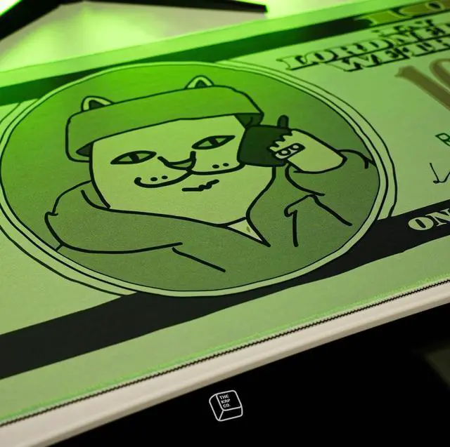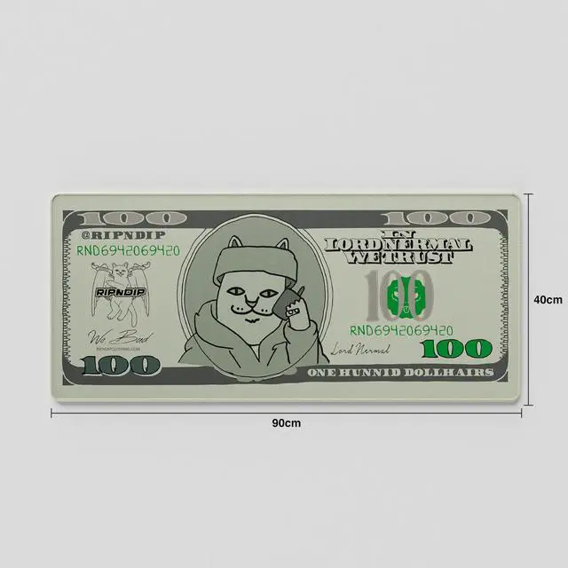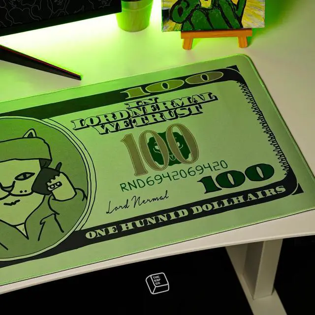 Moneybag Mouse Pad In Lord Nermal We Trust: Styled like a $100 bill but with One Hunnid Dollhairs and Lord Nermal front and center, this design is a perfect flex. Streetwear meets humor in the most Nermal way possible.