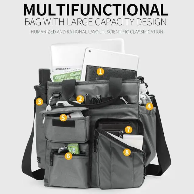 Rich and Practical Pockets This men's messenger bag has 9 multifunctional pockets in total; 2 side pockets for water bottles and umbrellas. Well-constructed, 1 padded laptop compartment protects your 15.6" laptop from accidental bumps. 1 organized compartment and 4 small pockets make your small items easier to find. There is also a large hidden pocket on the back.