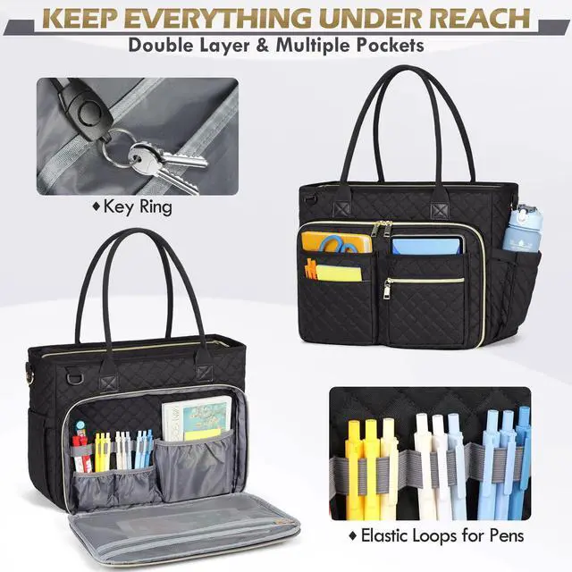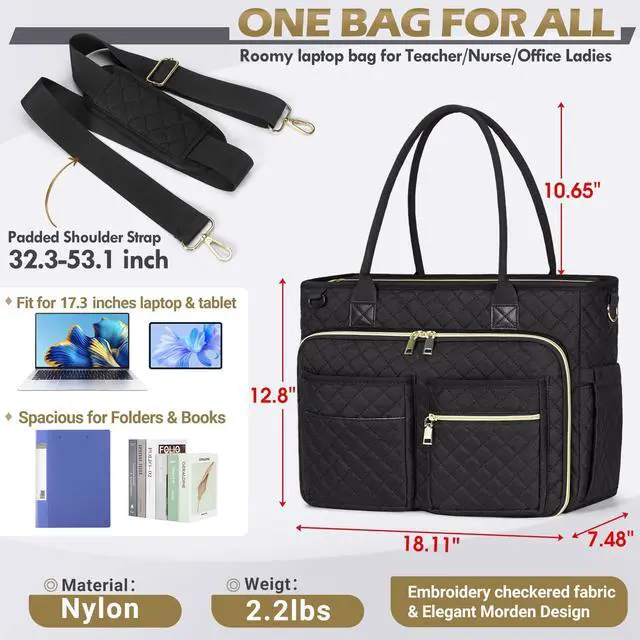 LARGE CAPACITY & MULTIPLE STORAGE- The large main compartment of this teacher laptop bag with 10 inner pockets could easily hold all your daily necessities/college supplies/teaching materials/medical supplies in an organized way. The padded laptop compartment of this teacher tote bag offers optimal protection, which can fit in a 17.3" laptop and a 12.9" iPad. Insulated pockets on both sides are designed for snacks or coffee storage and keep cold or warm for hours