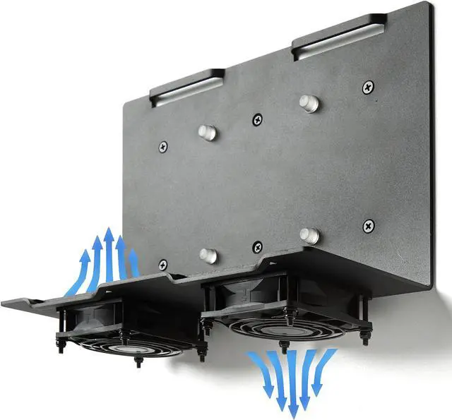 Vented Universal Wall Mount designed for your Desktop Computer, PC, NAS, CPU, Workstation, Computer Tower, UPS Unit, Uninterruptible Power Supply Unit, Battery Backup, A/V component, or other Electronic Device. 10 gauge - 3.2 mm Thick Cold Rolled Carbon Steel Powder Coated Black. Superior Gauge/Thickness compared to other Brands. Custom Designed in California, USA to accept 80mm Standard Case fans. Manufactured to keep your High-End Electronics operating at their optimal temperature. (Fans Not Included) Universal Mount M12875B