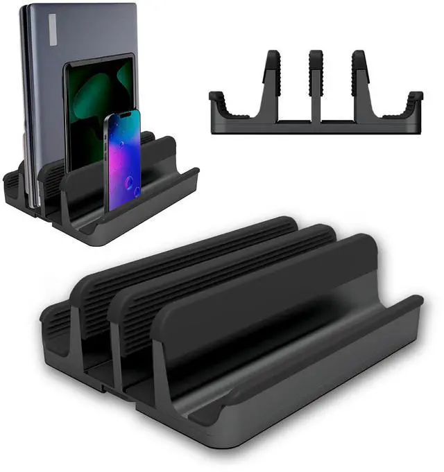 Hold more devices: Dock up to 4 laptops, or tablets or mobile devices in a single stand. Our laptop organizer has three sliding brackets that can be adjusted to secure up to four different laptops, with different thicknesses. A perfect laptop storage rack for multiple laptops.