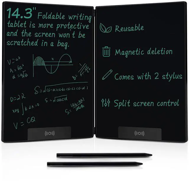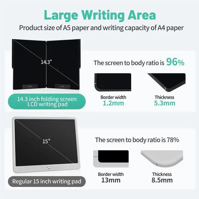 Large Writing Area: This is 14.3 inch folding screen lcd wriring tablet , which is equivalent to an A4 paper when opened, and the writing area accounts for 96% of the screen; Folded state is equivalent to an A5 paper, and can protect recorded information, prevent screen scratches; More comfortable recording, communicating, studying or working to use