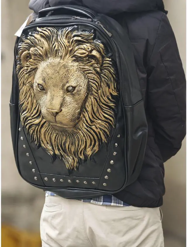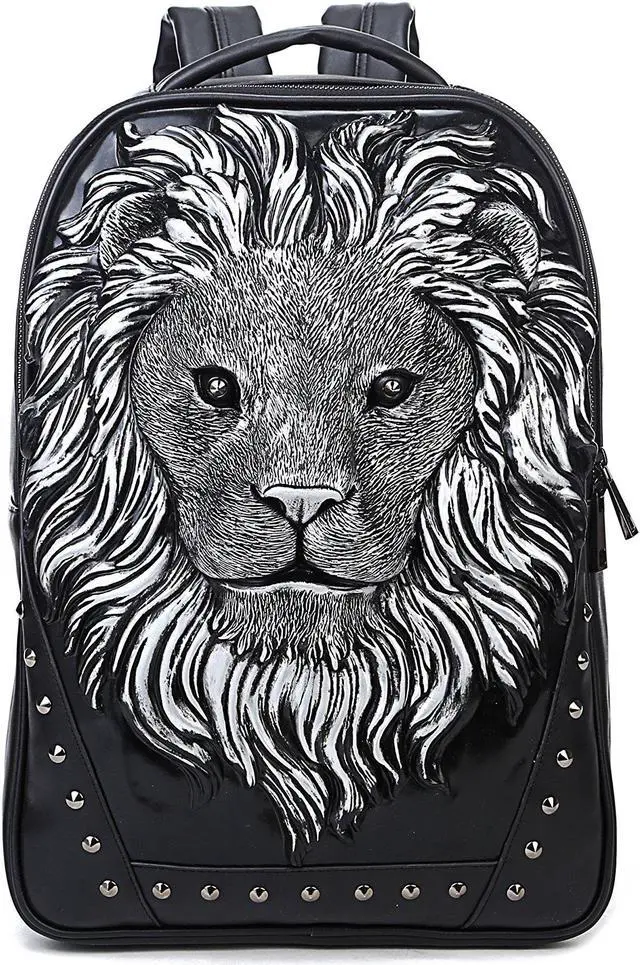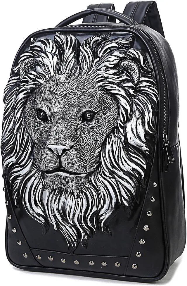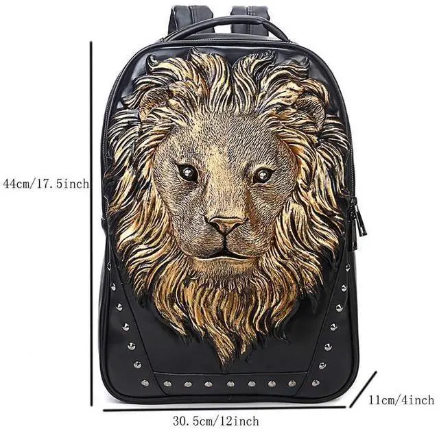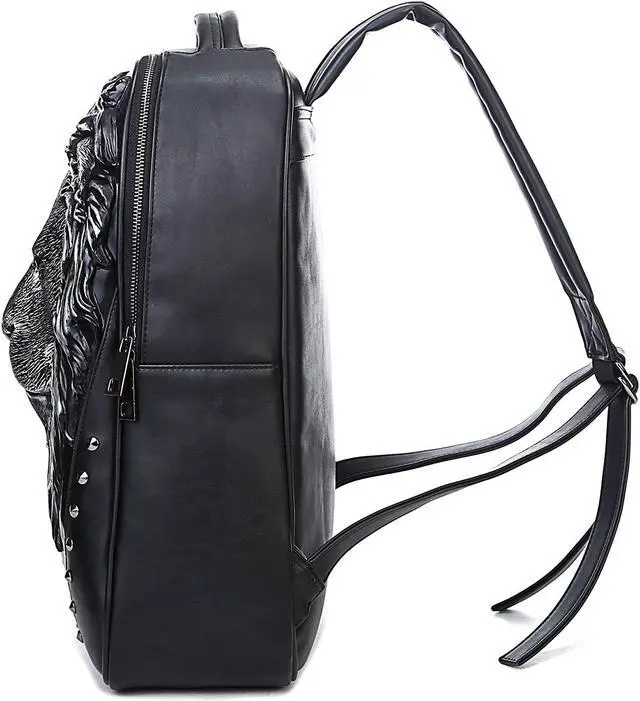 Berchirly Men Pu Leather Backpack Women Casual 3D Lionhead Studded Pack Travel Outdoor Daypack Laptop Bag