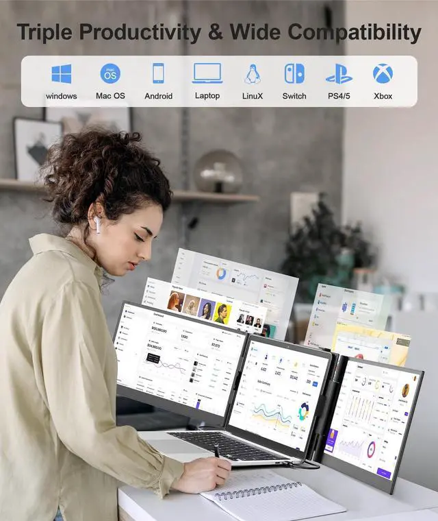 Increase Efficiency Up to 300%The extra screen for laptop portable supports extended, mirrored, duplicate, portrait, and landscape modesmultitask seamlessly across multiple screens to boost productivity by up to 300%. Ideal for remote workers, travelers, designers, and professionals on the go.