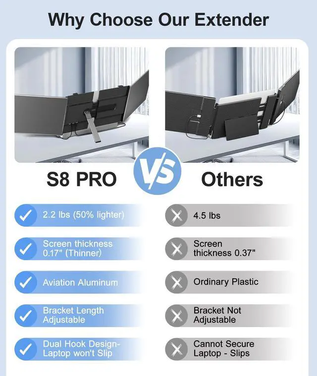 Ultra-Thin & Lightweight DesignThis ultra-slim laptop screen extender measures only 0.17 inches thick and weighs just 2.2 lbslighter and thinner than your laptoptruly designed for mobile productivity. Crafted from aerospace-grade aluminum, its durable, sturdy, and offers excellent heat dissipation. Paired with a premium leather protective case, its your perfect productivity companion wherever you go.