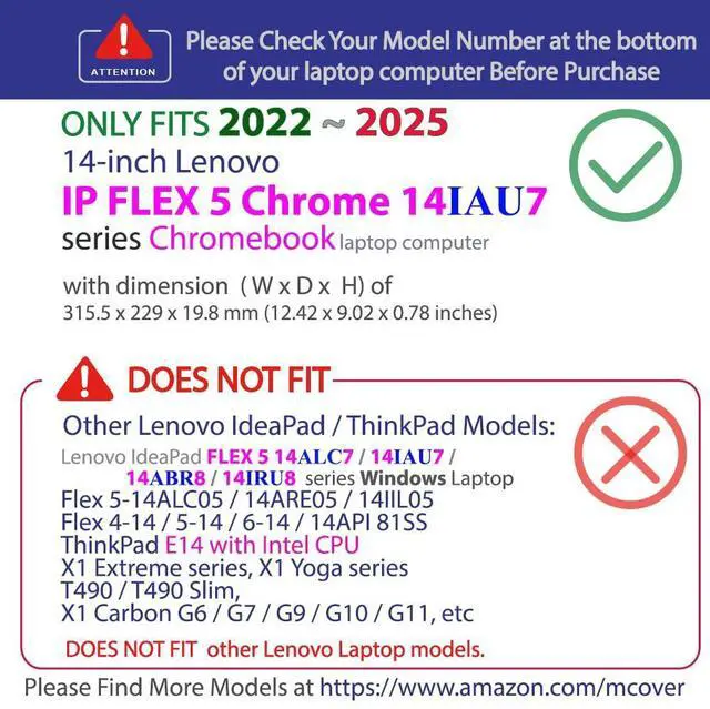 Designed to perfectly fit the 2022~2025 14" Lenovo IP Flex 5 Chrome 14IAU7 (Plus) series convertible Chromebook laptop computers with dimension of 315.5 x 229 x 19.8 mm (12.42 x 9.02 x 0.78 inches)