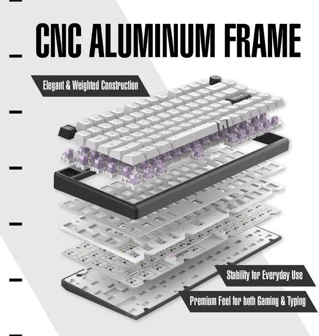 PREMIUM BUILD & BRILLIANT RGB CNCmilled aluminum frame, dyesub PBT AOPprofile keycaps, screwin stabilizers, and ultrabright RGB lighting create a rocksolid board that looks as good as it plays (IP54 nanocoated PCB for extra protection)