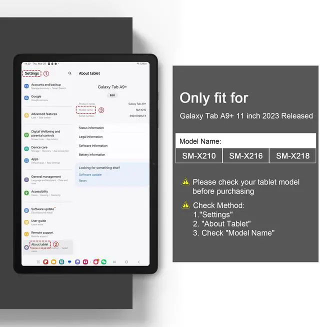 • Check Your Tablet Model: Compatible with Galaxy Tab A9 11 plus". Please check your tablet model before purchasing. Go to 1."Settings" , 2. "About" , 3. Check "Model Number", you'll see the model number: SM-X210/X216/X218