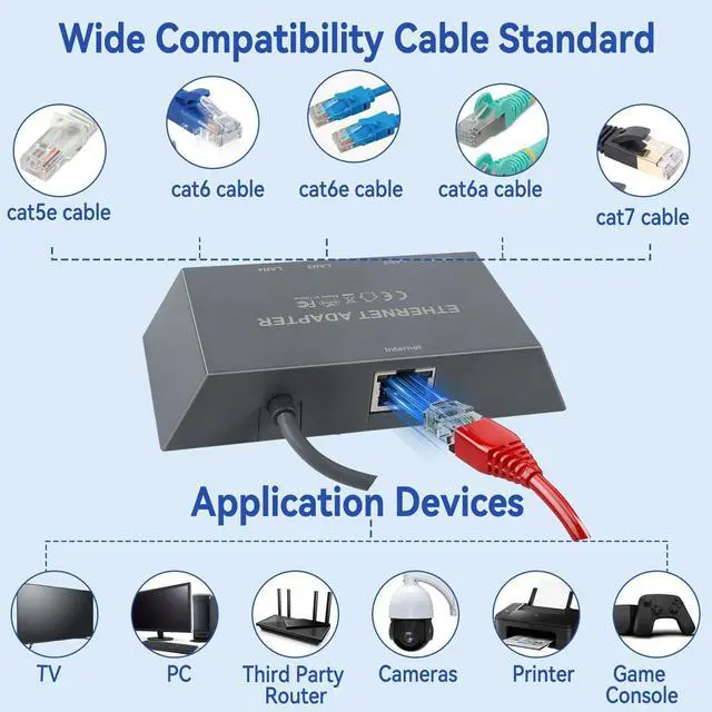 : Hardware Interface: Ethernet Compatible Devices: Desktop Data Link Protocol: Ethernet Data Transfer Rate: 1000 Megabits Per Second Cable Length: 1.6 ft/ 0.49 m Package includes: 1 x 4-Ports Ethernet Adapter