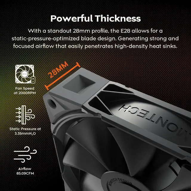 MONTECH E28 PWM 120mm Case Fan, 28mm Thick Fan for Enhanced Cooling Efficiency, PWM 4-Pin, FDB Bearing, Quiet Low-Noise, 2000RPM, AIO Compatible (Black, 3in1 Pack)