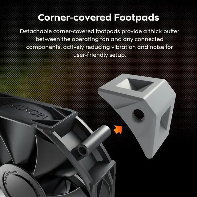 • Noise-Reducing Vibration Pads Corner pads absorb vibration and reduce noise while keeping the fan stable at high RPMs.