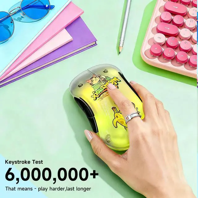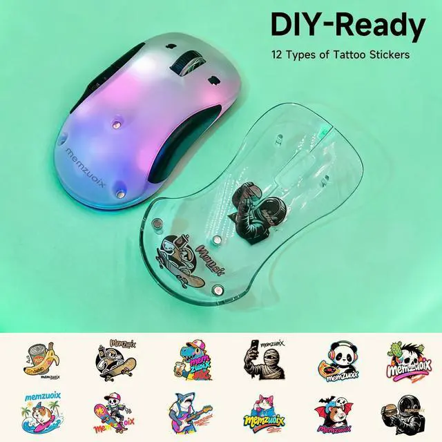 Stylish Transparent Wireless Mouse with 9-Color RGB & Magnetic Cover - Features auto-changing LED lights and a detachable magnetic cover that comes with 12 tattoo stickers for easy DIY customization (simply dampen and apply to the shell interior). Perfect for work, play, or as a unique gift. The wireless mouse delivers both aesthetics and functionality. ^^ Rechargeable & Energy-Saving - Built-in battery with USB-C charging (no battery replacements).