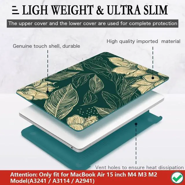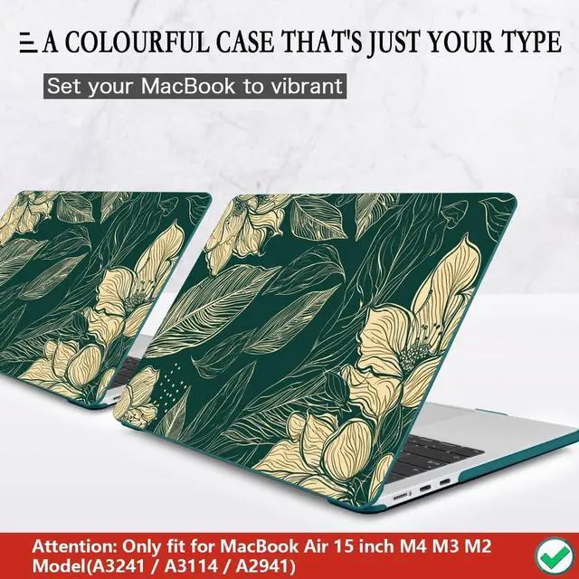 ^^ ATTENTION: Not 11 inch or 13/ 13.6 inch Case. This case is NOT compatible with Macbook Air 13/ 13.3, MacBook Pro 13/Pro14/Pro 15/Pro 16 2010-2022 Release Model. Please kindly Check Your MacBook Model "Axxxx" on the bottom before Purchase. Make sure youre ordering the correct size "A2941" or "A3114" or "A3241" for MacBook Air 15 inch Case. It will NOT fit if you bought the wrong size/item. ^^ Pretty Case, Logo No See Through Design. 15-inch (diagonal length) hard shell cover. 3D UV 4-layer process printing technology, beautiful case of individuality, Well-printed Elegant Floral design on a hard plastic case with soft touch texture. Logo no cut out design, artistic surface of the laptop that also makes your Silver / Starlight/ Space Gray/ Midnight macbook air 15 out of the ordinary while keep the original design. ^^ Two Separated Pieces Case, Snap on/Clip On Design. Top Cover and Bottom Cover Two pieces (separated cover) and Snap on design, easy to clip on and take off, let you open/close your MacBook freely all the time. Thunderbolt port access, also access to all ports without removing the case.