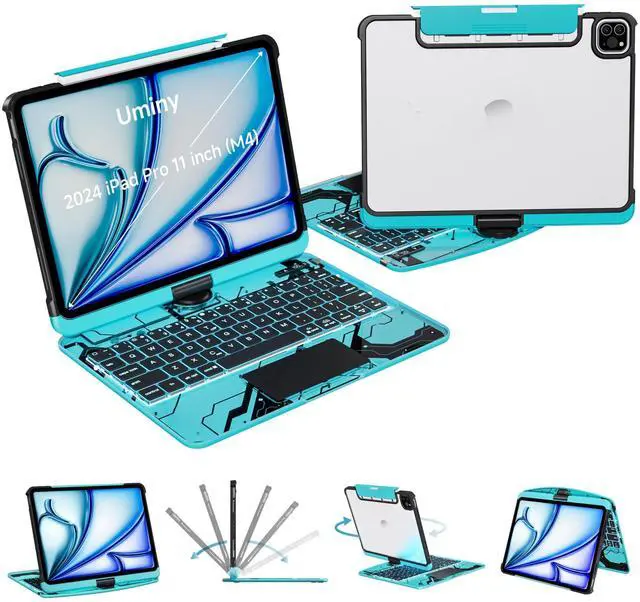Uminy iPad Keyboard Case for 2024 M4 iPad Pro 11 inch, Magic Wireless Keyboard with Trackpad 7 Color Backlit, 360 Rotating Stand Transparent Protective Cover with Pencil Holder (Cyan)