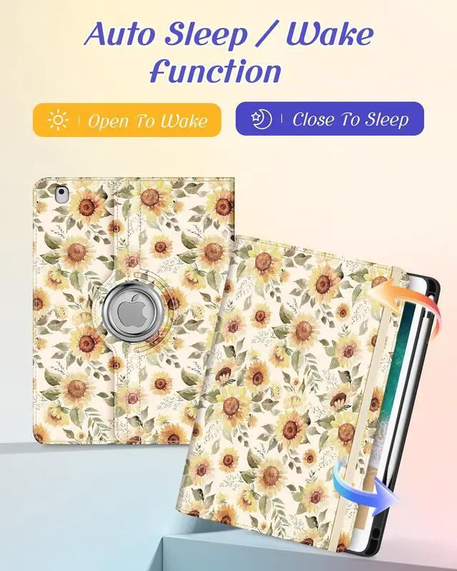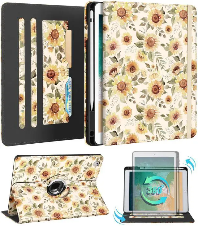 Kidcube for iPad 5th Generation Case 2017/Air 1st 2013/Pro 9.7 Inch Case 2016 - Women Girls Kids Cute Rotating Stand Folio Cover with Pencil Holder & Card Slot Girly Pretty Sunflower Design Cover