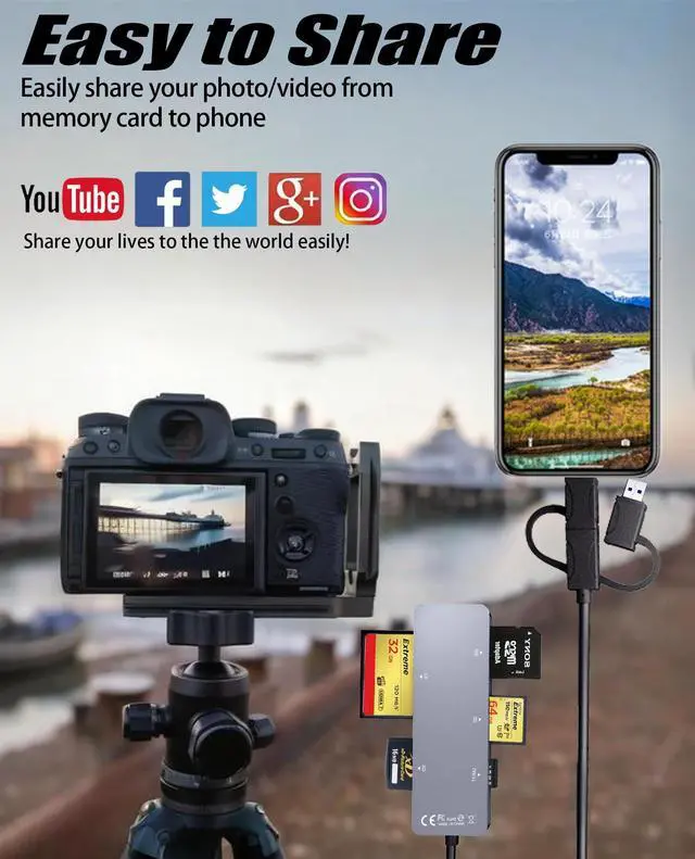 ^^ Compatible with Multiple DevicesThis universal sd card reader usb c for iPhone 16/ 15/ 14/ 13/ 12/ 11/ X / XS/ XR/ 8/ 7 series, iPad, Samsung Galaxy, Google Pixel, Google Nexus 5X 6P, MacBook, Surface, Huawei ect android phone and PC. (When using, it is necessary to ensure that the storage card format is FAT32). Supports OTG, so you can view pictures directly on your phone. ^^ Note When connecting the USB-C port to an Android phone, first insert the camera's memory card into the card reader, then connect the Android phone.