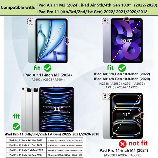 Compatible Models: for iPad Air 11 inch M3 (2025), (Model: A3266 A3267 A3270)for iPad Air 11 inch M2 (2024), (Model: A2902 A2903 A2904); for iPad Air 5th Gen 10.9" (2022) (iPad Air 5), (Model: A2588 A2589 A2591); for iPad Air 4th Gen 10.9" (2020) (iPad Air 4), (Model: A2316 A2324 A2325 A2072); for iPad Pro 11 (2022) (4th
