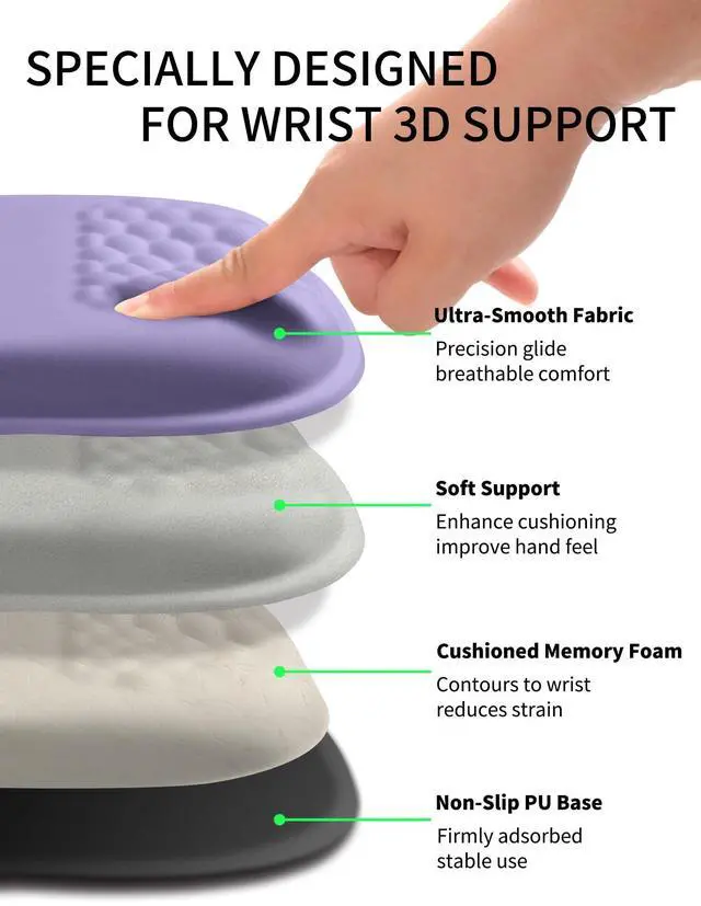 Ergonomic Wrist-huggingU-shaped holding design provides ergonomic 165 wrist bending and massage bead support, which can effectively relieve wrist pain and fatigue, improve carpal tunnel syndrome (CTS), and keep the wrist in the most comfortable state ^^ Classic Size 10.2 x 8.3 x 1.2 inches (260x210x30mm), optimized size, does not take up too much desktop space, while having a wider sliding area and all-round wrist support, comfortable for right-handed or left-handed ^^ Cursor TrackingThe high-density fabric has a smooth surface without pilling, slides quickly without lost frame rate, and is compatible with all types of mice for worry-free work.
