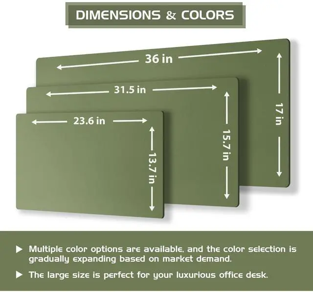 Colors and Sizes: Available in a range of colors and sizes, our desk pad can seamlessly blend into diverse office and home environments, catering to individual needs and preferences. Size of 25.6" x 13.7", 35.4" x 15.7", 37.8" x17", thickness 0.08 inches, thick enough to provide soft and elastic touching; large enough to accommodate your laptop, mouse, keyboard and journal ^^ Protection and Easy to