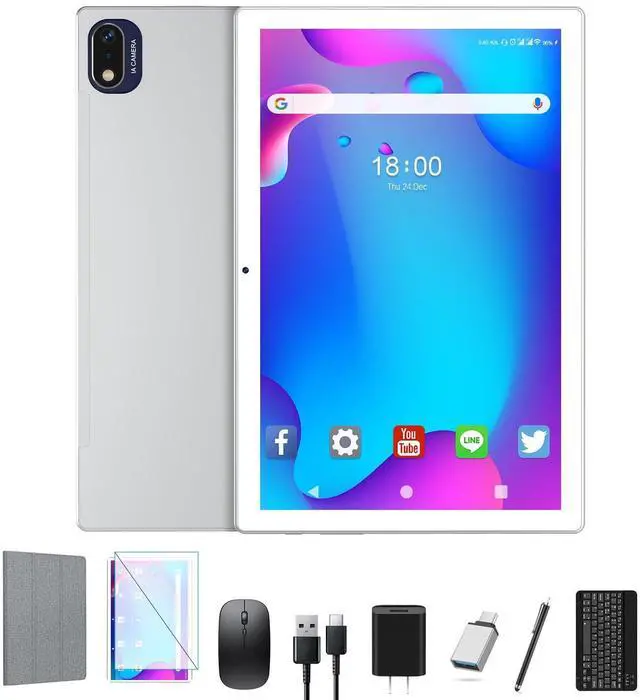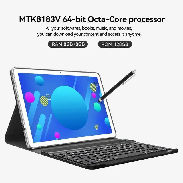 Save your favorites with 128 GB storage, and expand to up to 1 TB with TF card (sold separately). ^^ Playful GAMING TABLET With the MTK8786 octa-core processor easily conquer all games, to use this android tablet as a game station with 10.1 -inch HD display to maximizing your gaming experience. ^^ Versatile FOR WORK AND PLAY Thoughtfully packed bluetooth keyboard, mouse set, tablet case and stylus pen, screen protector, with this android tablet set you can get everything you need at once. Get a portable work station! ^^ Clear COMMUNICATION WITH DUAL CAMERA The 8 MP front camera makes for clear calls to friends and family on Zoom.