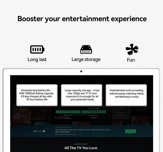 Beautiful DISPALY AND ANDROID SYSTEM Vivid 10.1 incell screen with 1280*800 resolution and dual speakers, powered by the newest Android 14 operating system (with GMS certification) for 2025, ideal for seamless streaming, reading, and gaming. ^^ Excellent PERFORMANCE Built with a powerful MTK8781V octa-core processor, 16 GB memory(8GB physical + 8GB virtual), and dual Wi-Fi 2.4G /5G for fast streaming, web browsing, gaming, and quick multitasking ^^ All-day ENTERTAINMENT With 18-hour battery life, maximize your downtime for reading, browsing the web, watching videos, and listening to music at home and on-the-go.
