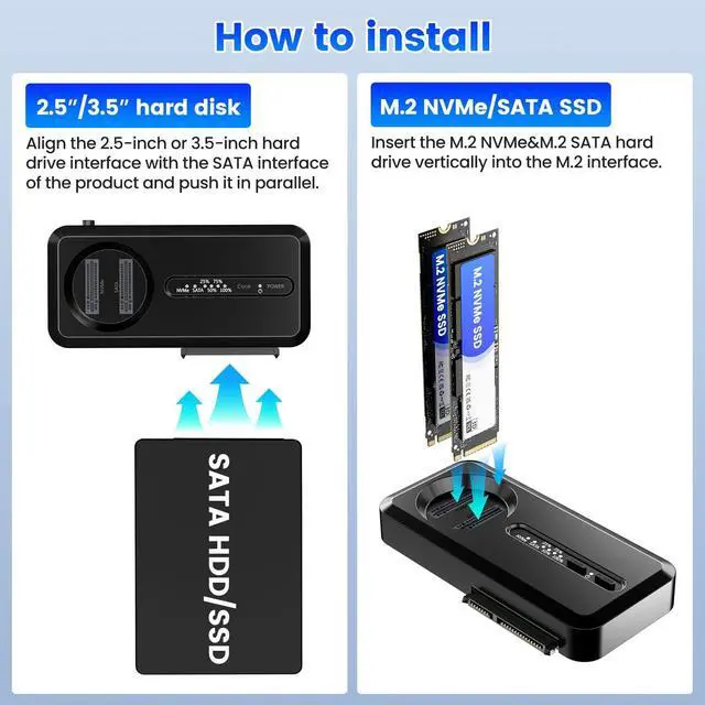 ^^ Dual Cloning Capability: Supports bidirectional cloning between M. 2 NVMe and M. 2 SATA drives, as well as between 2.5 / 3.5 -inch SATA drives and M. 2 NVMe drives making it an essential SSD enclosure adapter for versatile data management.