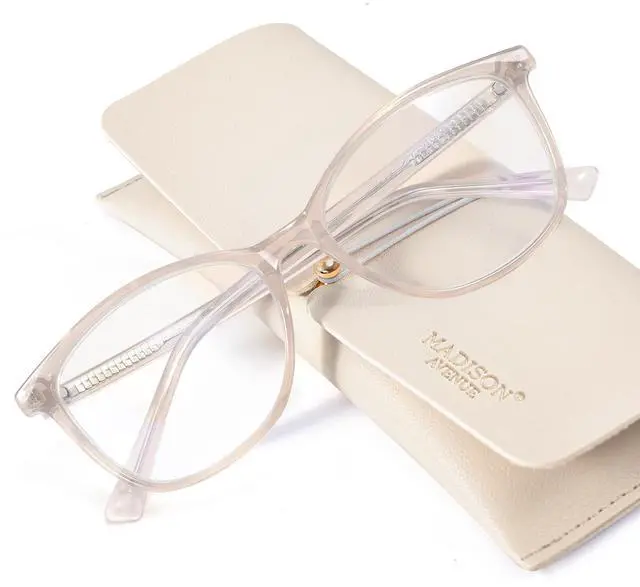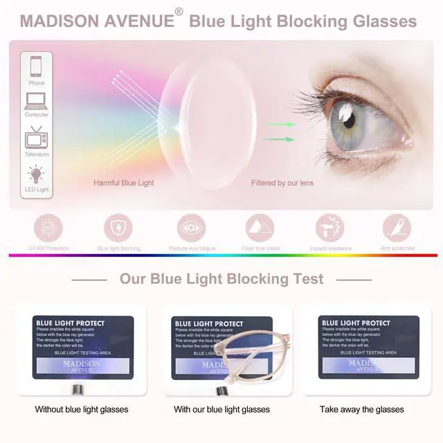 Gifted Package with Exquisite Leather CaseEach eyeglasses comes with a delicate leather case, a micro fiber glasses cleaning cloth and a booklet. Exquisitely package making it an ideal gift for friends and family! ^^ Madison Avenue Blue Light Blocking Lens Filter high level blue light from digital screen of computer, phone and TV, maintain HD clear vision with less color distortion. ^^ Relieve Eye Strain and help Sleep BetterReduce eye fatigue, headache, blurry vision caused long time exposion to blue light ray, protect eyes from UV and Glare. ^^ Metarial and DesignLight weight TR90 frame with anti-scrached PC lens, duarable metal hinge provide you comfort fit.
