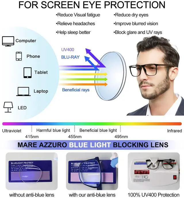 Relieving eye strains and headache for reading, watching TV, gaming, using computer or mobile phone, to get a better sleep at night.