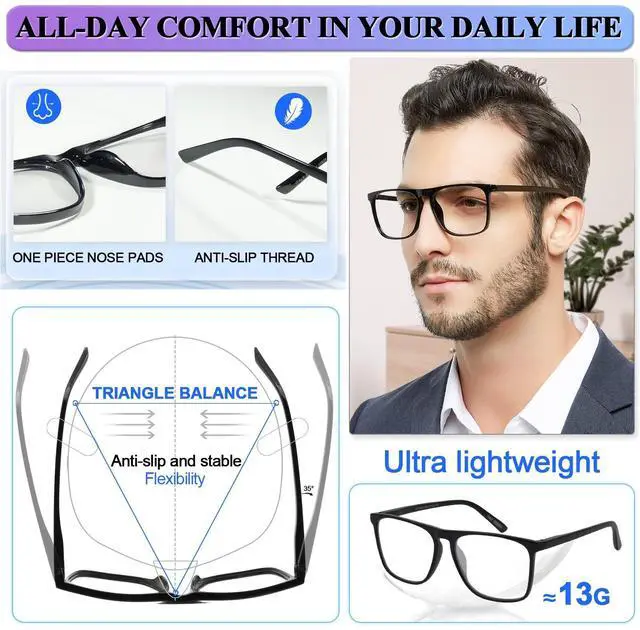 ^^ High definition: This lightweight computer readers effectively filters & blocks glares; HD blue light lenses give you bigger field of view without turning your neck to easily get a clear vision; sturdy & scratch resistant; has higher precision as well, which are perfect for reading, working or enjoying digital time at the office or party, at home, in bed. ^^ Comfortable fit - the mens blue light glasses is made lightweight frame with anti-blue light lens; with flexible spring hing wont pinch your face, so great fit for bigger and wider face; extra large reading glasses give you a broad vision without turning your head. Ultra-light blue light readers make you all-day comfy while reading, web surfing, gaming and screen working. ^^ Great value - bluelight reading glasses 5.00; A small screwdriver to tighten the screws regularly; A glasses rope to avoid loss and breakage; A soft cloth to keep readers clean; A portable carrying bags to avoid scratching; as a perfect gift for family and friend!