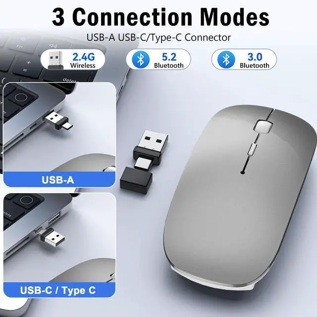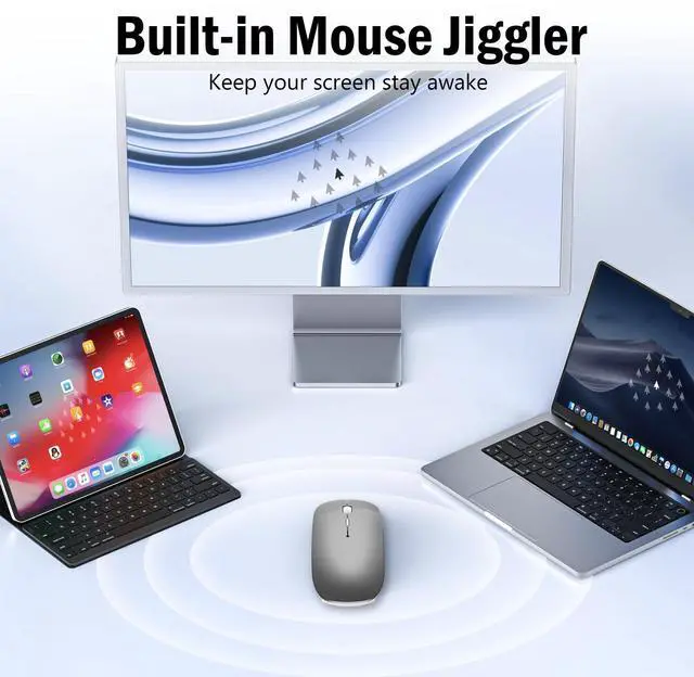 Ultimate Versatility for All Devices Experience seamless compatibility with all your devices! FYBC wireless Bluetooth mouse Jiggler offers Bluetooth connectivity for MacBook Pro, MacBook Air, iPad Pro, iPad Air, and more. Plus, the innovative dual-port 2-in-1 receiver ( 2.4GH z USB-A and USB-C) guarantees FYBC portable macbook wireless mouse can provide stable and reliable connections for all your devices no hassle, just performance ^^ 2-in-1 Wireless Mouse & Undetectable Mouse Jiggler FYBC 2025 upgraded wireless Bluetooth mouse for macbook pro combines a cordless mouse and jiggler, two essential functions in one device! No need for an extra mouse mover jiggler simply press and hold the DPI button for 3-5 seconds to activate the undetectable jiggler mode to keep your computer from locking when you have to step away is perfect for office workers, remote workers, IT professionals, and more ^^ Precision with Adjustable DPI & Optical Tracking Take control with precision! FYBC wireless mouse for Macbook Air features a high-performance optical sensor with 3 adjustable DPI levels (800, 1200, 1600 DPI) that cycle with just a quick press.