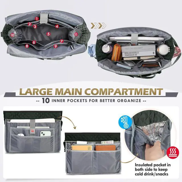 LARGE CAPACITY & MULTIPLE STORAGE- The large main compartment of this teacher laptop bag with 10 inner pockets could easily hold all your daily necessities/college supplies/teaching materials/medical supplies in an organized way. The padded laptop compartment of this teacher tote bag offers optimal protection, which can fit in a 15.6" laptop and a 12.9" iPad. Insulated pockets on both sides are designed for snacks or coffee storage and keep cold or warm for hours ^^ MULTIPLE ORGANIZER POCKETS- Teacher Work Bag Size: 16.54"L x 5.91"