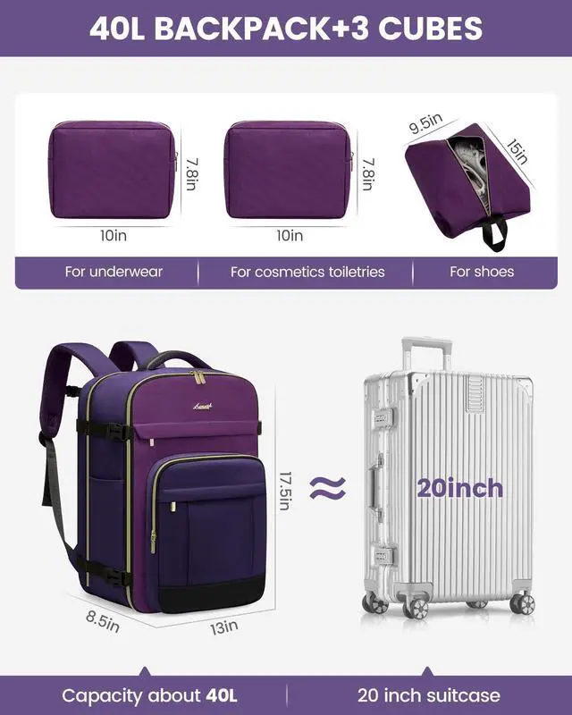 Airline-Approved Carry-On Size: This travel backpack (18x14x8 inches) is perfect for budget airlines like Spirit, Frontier, and Jet Blue, fitting seamlessly under seats and in overhead compartments. Ideal for hassle-free travel ^^ Spacious 40L