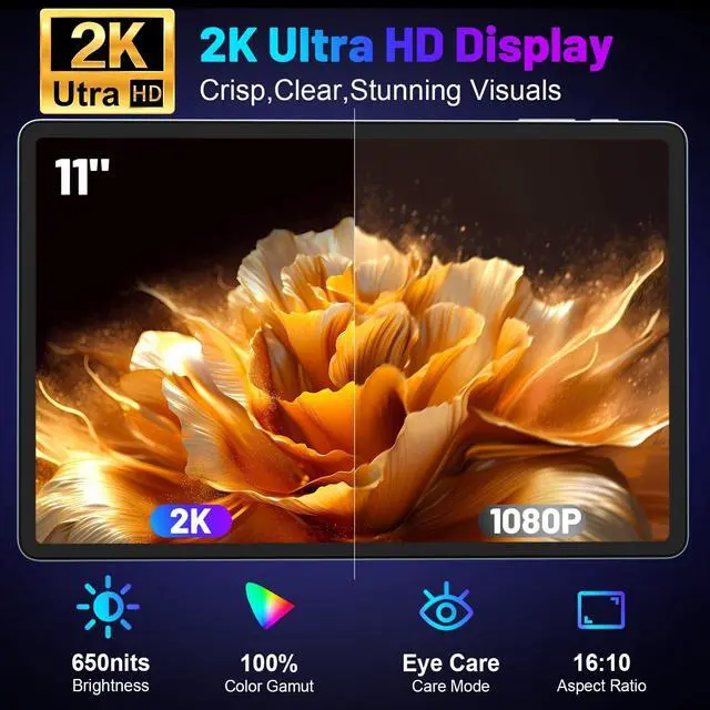 • 11 2K FHD Display, Clear & Vibrant Visuals: Experience crisp visuals on the 20001200 LCD display. The 11-inch computer tablet offers vibrant color, wide viewing angles, and eye comfort modeideal for online classes, movies, or drawing with a stylus