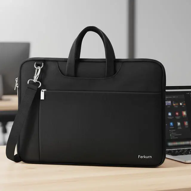 Internal dimensions: 16.9" x 12.4" x 1.1". Crafted from water-repellent polyester, this laptop bag ensures reliable protection against water and moisture. Its lightweight, slim, and soft design enhances safeguarding for your laptop while maintaining flexibility. Complemented by a detachable shoulder strap for versatile portability, this laptop bag is ideal for daily commutes or travel, combining practicality with modern aesthetics.