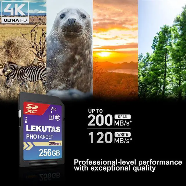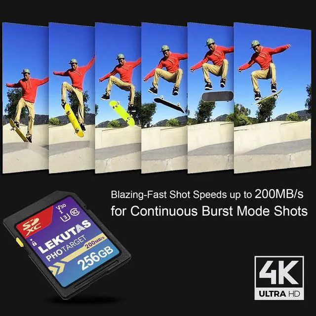 Non-Stop Shooting and Transfers in a Blink Read speed up to 200MB/s and write speed up to 130MB/s. Spend less time transfering means more time creating. You will NEVER miss a shot. ^^ Perfect for Shooting 4K UHD Video Features U3 and V30 ratings with A2 performance that helps with fast loading and 4K UHD video capture and sequential burst mode photography. (Full HD (1920x1080) and 4K UHD (3840 x 2160) video support vary based upon host device. ^^ Adapts To Wide Range of Needs Whether using DSLR, Mirrorless Camera or PC, count on the LEKUTAS SDXC card for extensive compatibility.
