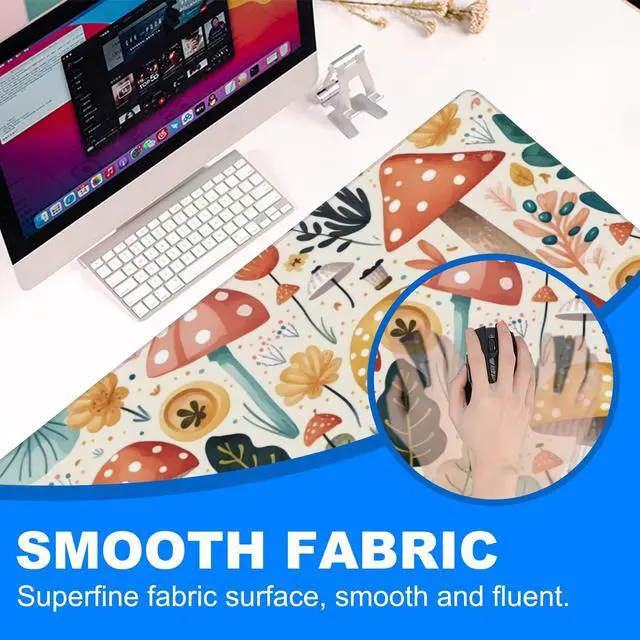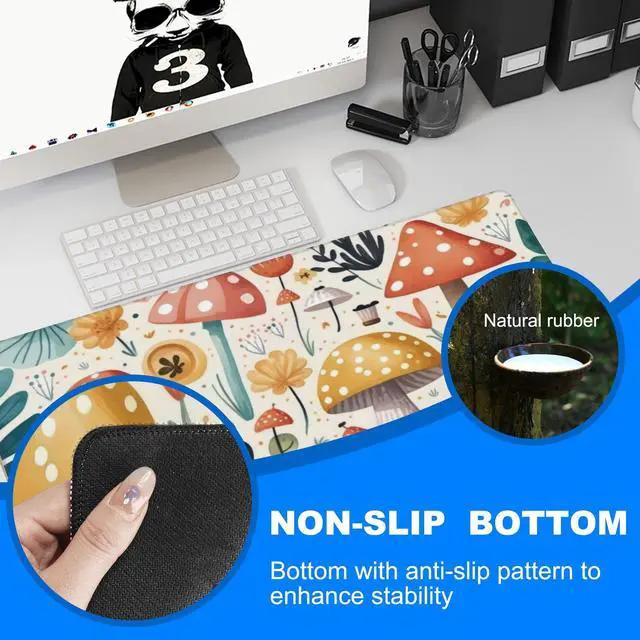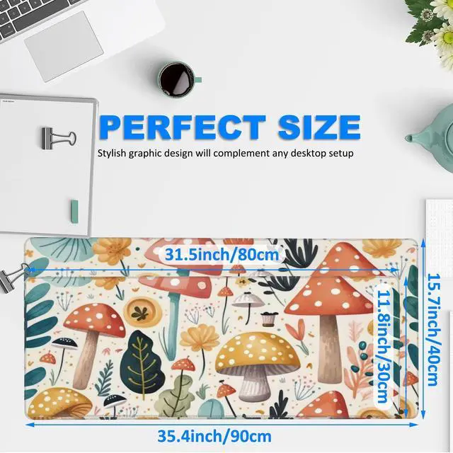 Desk Pad, Hand Drawn Charming Mushroom and Leaves Extended Gaming Mouse Pad Large, 35.4"x15.7" Big Mouse Pad with Non-Slip Base and Stitched Edge, Long Computer Keyboard Mouse Mat for Home Office Work