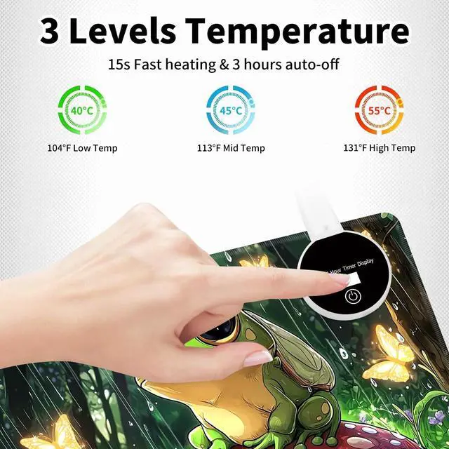 Control Levels: The heated deskmat offers three temperature settings (40C, 45C, and 55C with a 5C range), You can select from 3 different heat levels, with the highest being 55 and the lowest being 40 Press switch for three temperature settings. Heating area is over than 95%. 2.