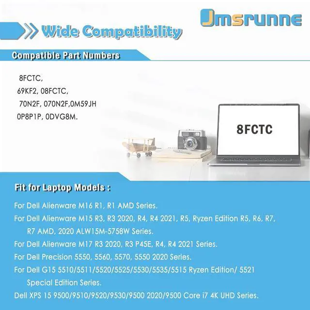 Purchasing Note: Due to the complexity of laptop battery models, you may not be able to accurately determine the model you need to purchase, Please open the back cover of the laptop to confirm the original battery model number ^^ dell 8FCTC Compatible Part Number 8FCTC, 69KF2, 08FCTC, 70N2F, 070N2F, 0M59JH, 0P8P1P, 0DVG8M. ^^ Compatible Laptop/Notebook Models For Dell Alienware M16 R1, R1 AMD Series. Fit for Dell Alienware M15 R3, R3 2020, R4, R4 2021, R5, Ryzen Edition R5, R6, R7, R7 AMD, 2020 ALW15M-5758W Series. For Dell Alienware M17 R3 2020, R3 P45E, R4, R4 2021 Series. For Dell Precision 5550, 5560, 5570, 5550 2020 Series. For Dell G15 5510/5511/5520/5525/5530/5535/5515 Ryzen Edition/ 5521 Special Edition Series. Dell XPS 15 9500/9510/9520/9530/9500 2020/9500 Core i7 4K UHD Series. ^^ TipsIf the new battery is not recognized during the initial installation, please reinstall and check if the interface is fully connected. Discharge the new battery to 5% not 0%, then charge and cycle 3-4 times to wake up the new battery) ^^ High qualityEvery battery has passed factory testing, grade A cells ensure fast charges, built-in circuit protection ensures both safety and stability.