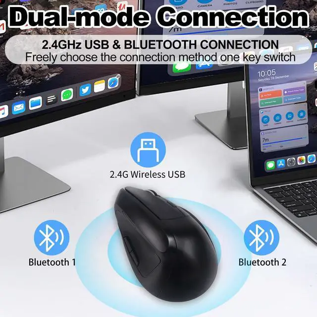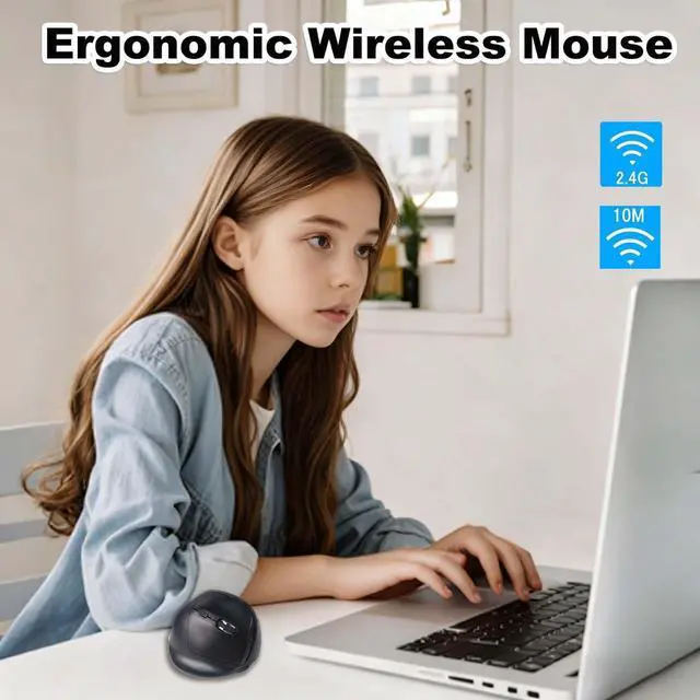 Wireless Ergonomic Mouse - Comfort, Precision and Seamless Connection! Designed for long-term use, this ergonomic mouse focuses on hand health and efficiency with 2.4G + Bluetooth 5.2 dual-mode technology and wireless charging. The ergonomic mouse wireless is designed to reduce wrist pressure and fits the natural palm shape perfectly, making it ideal for long-term work, gaming or multitasking. The bluetooth mouse rechargeable supports dual-mode connection for flexibility and convenience, and can switch between settings to ensure smooth cursor control in any task. The 2.4 Optical Ergonomic Mice ensures a comfortable experience for right-handed users with its 116x83x67 mm size and 7 buttons (including scroll and side buttons).