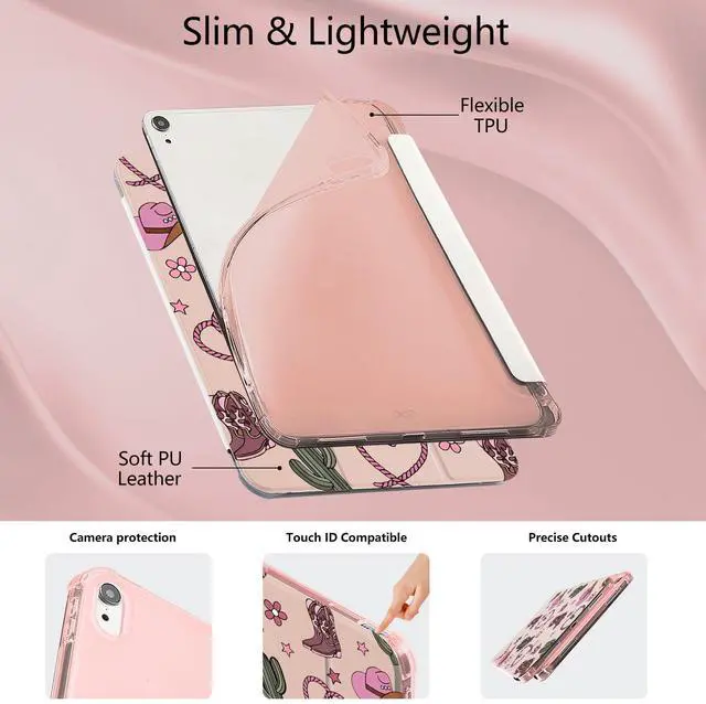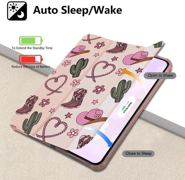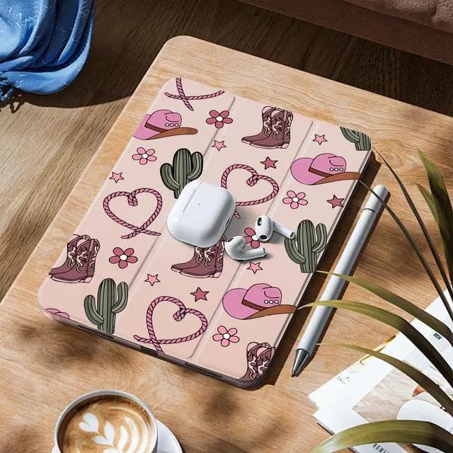 Protection: This Retro girly western case for ipad is made of two materials. The comfortable and soft silicone and high-quality durable TPU material provide a comfortable touch for the pad. The back of this cute cowgirl pattern case for ipad is made of soft TPU, which provides full body protection and is more durable than traditional silicone materials. It is less prone to yellowing, prevents scratches, and maximizes the protection of your pad from damage and scratchesAuto Wake/sleepBuilt-in magnetic strip, our cute cowgirl pattern case for ipad can automatically wakes or puts your tablet to sleep when the lid is opened and closed, protecting and extending battery life; precise cutout also completely supports newest touch ID key function. Built in pen holder ensures the safety of your pencil. Adjustable angleThe trifold stand shell design of this Retro girly western case forapple ipad can easily change the angle to meet your viewing and typing needs. This stylish hat print case for ipad can be folded into a stable triangle, firmly supporting your pad. Whether it's work, study, or watching movies, they can meet your needsPerfect