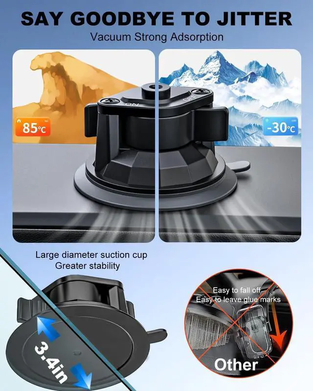 Military-Grade Vacuum SuctionTablet holder for car windshield Adopts upgraded super-large vacuum suction cup technology, single-point suction is increased by 200%, and it can firmly adsorb even on rough roads. It will not leave marks after disassembly, and the suction will not decrease after repeated use. Say goodbye to the risk of the bracket falling off ^^ Bold Metal Arm + Non-Slip Textured Metal Ball HeadThe tablet mount for truck Dashboard is made of CNC precision-processed aviation metal, and the key parts have been fatigue tested 30, 000 times. Rust-proof metal parts + UV-resistant silicone, performance does not degrade in extreme weather.