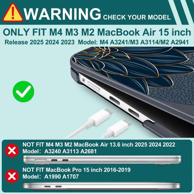 Compatible With - Only for M4/M3/M2 MacBook Air 15" 2025 2024 2023 (Only compatible model: A3241/A3114/A2941). Please confirm the model on the bottom of the MacBook before ordering ^^ Durable Material - MacBook Air 15-inch case is made of hard PC material, effective anti-slip/shockproof/anti-scratch etc ^^ Case Design - The case adopts the top and bottom case separation design, easy to install and remove ^^ Case Port Design - Precise cutouts allow full access to all ports, features, buttons, and Touch ID functionality ^^ Package - Included 1 MacBook Air 15 inch Case, 1 Keyboard Cover, 1 Trackpad Protector, 2 OTG Adapter