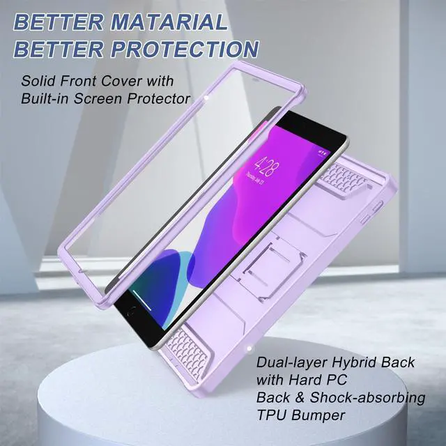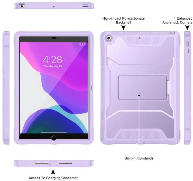 CompatibilityExclusively designed for Apple 10.2 -Inch iPad 9th generation 2021 Release (A2602 A2603 A2604 A2605); iPad 8th Generation 2020 Release (A2270 A2428 A2429 A2430); iPad 7th Generation 2019 Release (A2197 A2198 A2200) ^^ Rugged Armor Full ProtectionMulti-layered hard PC back and flexible TPU bumper provide full protection against drops, bumps, and impacts, also easy to install ^^ Built-in Screen ProtectorPrevents your New Apple iPad 9th / 8th / 7th Gen screen from scratches without compromising sensitivity and provides full protection ^^ Precise Cutouts Precise cutouts and design allow easy access to all ports, sensors, speakers, cameras without removing the case ^^ Built-in KickStand Functional pop-out kickstand with dual stand angles for easily enjoying movies and better working.