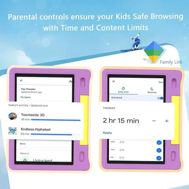 30% Faster Performance in 2025Powered by a 2GHz octa-core processor and Android 14, this kids tablet delivers smooth performance with a 10 1280x800 IPS HD display, 8GB (4+4) RAM, and 64GB storage (expandable up to 1TB). Perfect for safe learning and fun, with plenty of space for apps, videos, and games. ^^ Kid-Friendly Content & Parental ControlsPre-installed with Google Kids Space and YouTube Kids, this tablet offers fun, age-appropriate content for kids 3+. Download educational apps like Khan Academy Kids, Duolingo, and ABC Mouse. Parents can manage screen time, filter content, and track activity with Google Family Linkensuring a safe and educational experience.