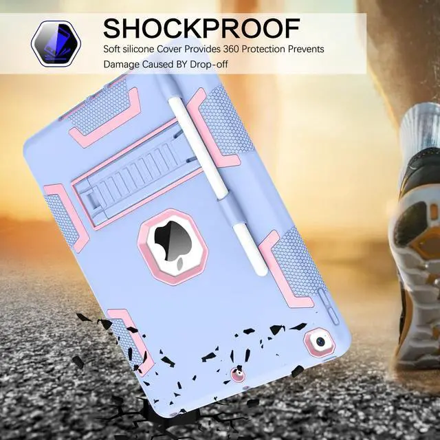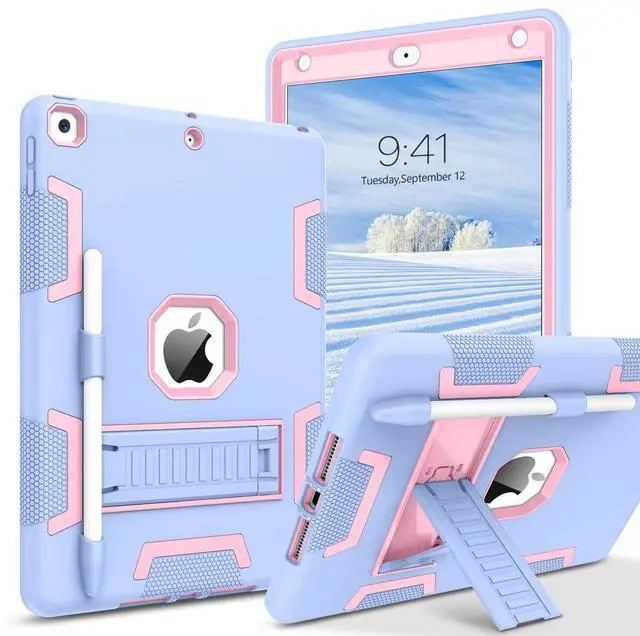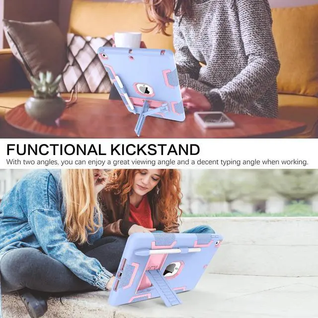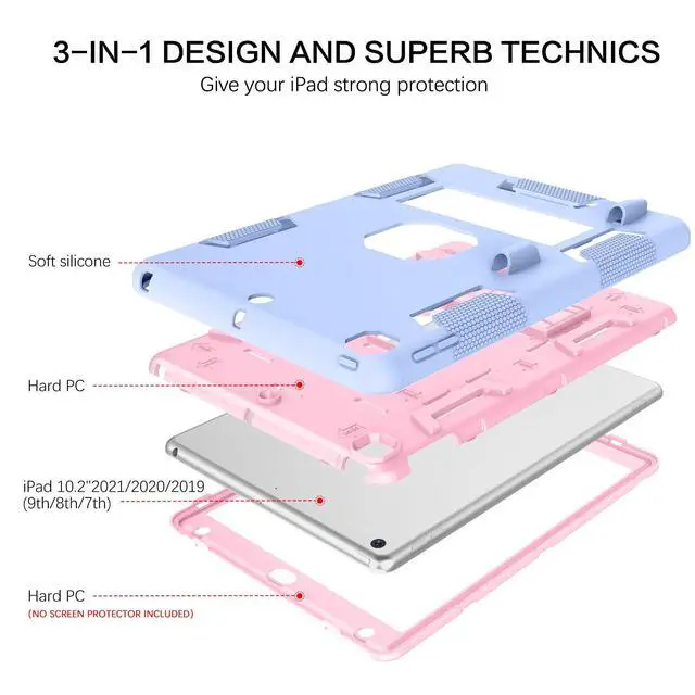 (ATTENTION: NO Screen Protector Included) ^^ Advanced 3 Layer ProtectionPremium hybrid hard Polycarbonate (PC) + soft Silicone rubber + open front hard Polycarbonate (PC) materials withstands drop, bump and shock with four corner cushioning for protection, safe for the Kids. ^^ Built-in Pencil Holder & Kickstand this shockproof tablet case has a built-in sturdy kickstand, you can adjust for optimal viewing and typing positions based on your needs. Designed with a pencil holder easily to carry your Apple pencil with your device.