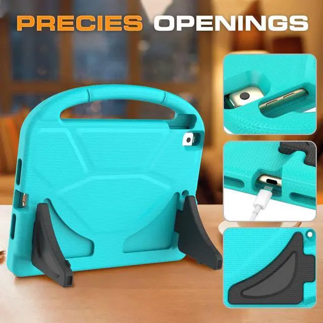 Compatibility- Designed for iPad 9th Generation (iPad 10.2" 2021, Model: A2602, A2603, A2604, A2605), iPad 8th generation (iPad 10.2" 2020, Model A2428 A2429 A2430 A2270), iPad 7th Generation (iPad 10.2" 2019, Model A2197, A2200, A2198) ^^ Shock Protection- Kids case for iPad 10.2 Inch is made from a durable, kid-safe, lightweight, and shock-resistant EVA material, your device is effectively protected from scratches, drops, bumps and impacts ^^ Built-in Kickstand- iPad 10.2 kids case comes with built-in stand, chooses optimal viewing and typing positions (2 Mode) based on your needs, also it's easy for both kids and adults to carry ^^ Precise Cutouts - It's easy to access all buttons, speakers, cameras and charging port, all the ports are where they should be ^^ Built-in Screen Protector- With built-in crystal-clear screen protector, completely covers your tablet, protects your Pad 9/8/7 Gen from scratches and dust