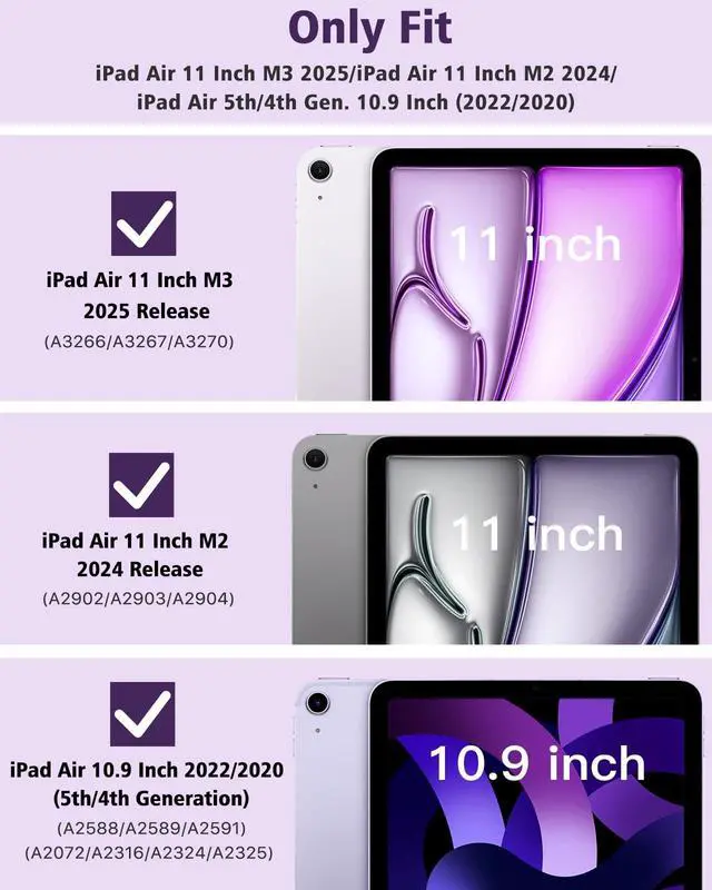 • Compatibility: Preciously designed for iPad Air 11 Inch M3 2025(A3266/A3267/A3270), iPad Air 11 Inch M2 2024(A2902/A2903/A2904), iPad Air 5th generation 2022(A2588/A2589/A2591), iPad Air 4th generation 2020 (A2072/A2316/A2324/A2325). Note: It will not be compatible with other iPad