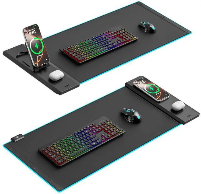 Mousepad Keyboard mat powered by USB and wireless charging powered by Type-C, plug and play. They require separate power connections and can operate separately