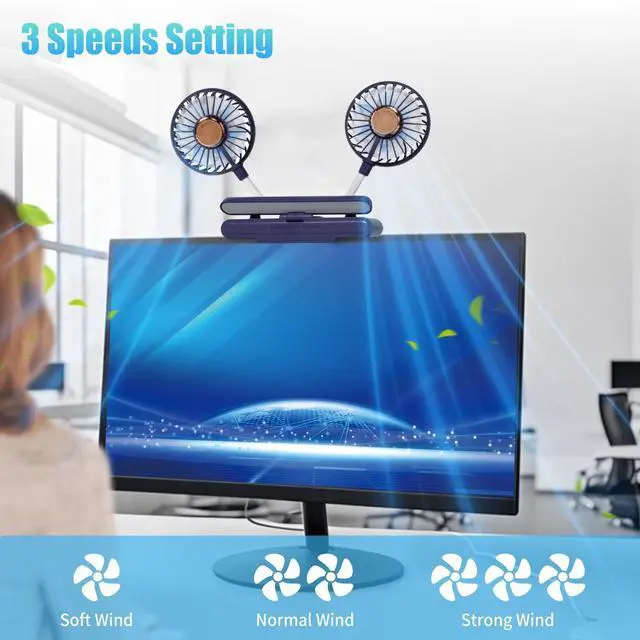 Clip On Monitor Fan with Light BarThis monitor fan is not only a fan, but also a lamp. With double heads, it's like having two tiny wind gods blowing a cool breeze while you work. The light bar ensures youre never working in the dark. Built-in LED white light design effectively reduces glare and reflection on the screen, thereby reducing eye fatigue. The lighting angle and brightness of the lights can be freely adjusted according to your needs, It has 3 adjustable brightness levels. ^^ 360 Rotatable Fan HeadsThe 2 heads of desktop fan can be adjusted 360 vertically and horizontally (Use the bendy rods below to easily adjust them individually.